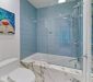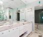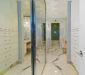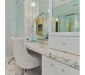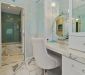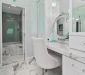 Old Hollywood Style meets European simplicity in a galley master bathroom that makes use of every square inch creating a relaxing, well-organized, efficient space. At the top of the design wishlist... lots of drawer storage for bathroom necessites including linens, towels, clothing and locked jewelry storage. This glamorous bathroom sparkles with white Italian marble and crystal light fixtures that bounce reflective light at the layered mirrors. The main bath area features a vanity dressing table, a private escape to pamper yourself with some quality time from the outside world. Small spaces can be challenging to design... but do offer great rewards when the space is mastered.